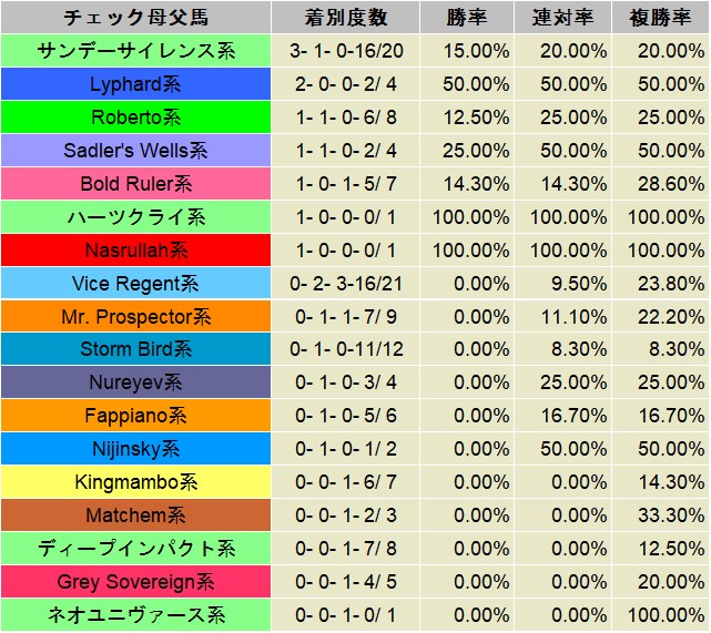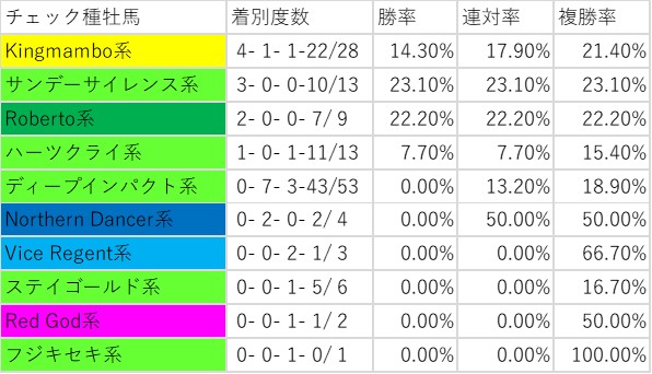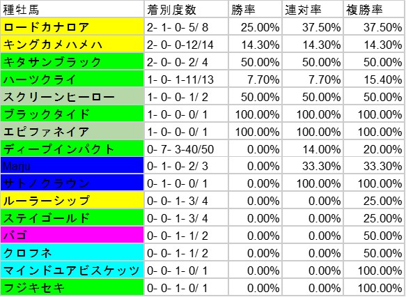 大きな傾向はないですが、Vice Regent系(クロフネやフレンチデピュティなど)は頭数が多い割に勝てていません。