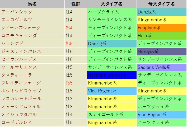 ほかにも去年2着だったタスティエーラはノーザンダンサー系とサンデーサイレンス系となっており、相性が良いです。